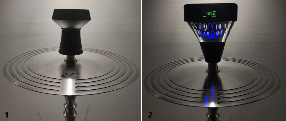 Image : 1 = foyer en argile classique, 2 = tête d'E-Shisha (sur le même narguilé)